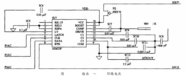 HT2012需要外部提供460.8kHz的時鐘信號,且要求時鐘頻率的誤差是0.1%,若直接入一個460.8kHz的晶振不僅會引起系統(tǒng)功耗的增加,而且該晶振屬于非標(biāo)準(zhǔn)晶振,需專門定制。為了解決這一問題,在系統(tǒng)中采用一片1.8432MHz的晶振以產(chǎn)生時鐘信號,再經(jīng)分頻器CD4013進(jìn)行4分頗,可輸出1.8432MHz/4=460.8kHz的分頻信號供HT2012使用。AD421其內(nèi)部的電壓調(diào)節(jié)器與外部的場效應(yīng)管DN25D對輸入到AD421的電壓進(jìn)行調(diào)整,可提供+3.3V電壓作為其他設(shè)備的電源。HART發(fā)出的FSK信號,經(jīng)過一個電容耦合送到AD421中,轉(zhuǎn)換成相應(yīng)的0.5mA正弦電流信號,實(shí)現(xiàn)電壓信號到電流信號的轉(zhuǎn)換,同時,疊加在4~20mA的電流上送給接收設(shè)備,實(shí)現(xiàn)了HART協(xié)議的信息的交換。本電路耦合電容取為0.0033μF,如圖5所示。