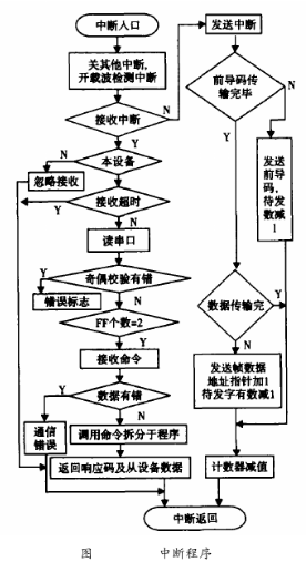 在HART通信中,鉆井泥漿流量計作為從設(shè)備進(jìn)行通訊,所以這里的軟件設(shè)計只是針對于從設(shè)備。HART通信采用水平和垂直校驗的方法。當(dāng)檢測到接收數(shù)據(jù)有差錯時,則等到主設(shè)備命令幀發(fā)完后,通知主設(shè)備數(shù)據(jù)接收有誤。主設(shè)備則重新發(fā)命令幀,從而保證通信的準(zhǔn)確可靠。HART中斷子程序流程圖如圖6所示。由于HART通信為主從方式,HART幀中每個字節(jié)在物理層傳輸需要9ms左右,為了保證通訊的實(shí)時性,通訊程序采用串行口終端接收/發(fā)送。該中斷所要完成通信中的主要任務(wù),即接收和發(fā)送幀,幀的拆分和打包。