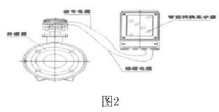 化工污水管道流量計是由流量傳感器和轉(zhuǎn)換器(也叫顯示器)兩大部分組成。測量管上下裝有激磁線圈,通激磁電流后產(chǎn)生磁場穿過測量管,一對電極裝在測量管內(nèi)壁與液體相接觸,引出感應電勢,送到轉(zhuǎn)換器。激磁電流則由轉(zhuǎn)換器提供。如圖2所示: