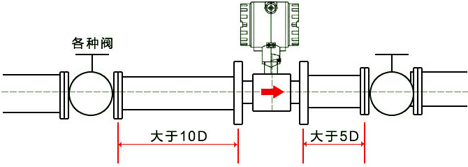 1、對直管段的要求:必須水平安裝在管道上(管道傾斜在5以內),安裝時流量計軸線應與管道軸線同心,流向要一致。上游管道長度應有不小于2D的等徑直管段,如果安裝場所充許建議上游直管段為20D、下游為5D。
