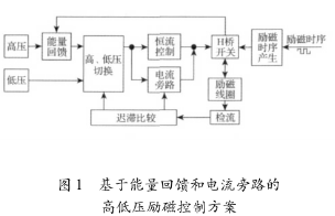 基于能量回饋和電流旁路的高低壓勵磁控制方案框圖如圖1所示,主要由高、低壓電源、能量回饋電路、高、低壓切換電路、恒流控制電路、電流旁路電路、H橋開關電路、檢流電路和勵磁時序產(chǎn)生電路組成。