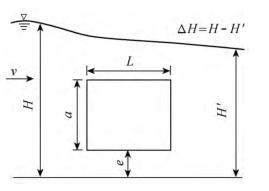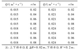 有限水域的浮體結(jié)構(gòu)在不同來流動水中運行時,浮體結(jié)構(gòu)位置的改變會對流場產(chǎn)生影響,從而影響浮體結(jié)構(gòu)的泄流能力以及穩(wěn)定性。試驗過程中固定浮體結(jié)構(gòu)的體型不變(長L=0.20m,寬B=0.30m,高a=0.10m),分別選取4種不同來流流量Q及浮體結(jié)構(gòu)位置e,控制浮體結(jié)構(gòu)在上、下游水位不變的條件下進(jìn)行試驗,具體試驗參數(shù)設(shè)計及說明見表1以及圖2。