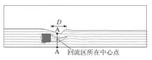 來自上游的水體經(jīng)浮體結(jié)構(gòu)的阻擋作用,水流繞流經(jīng)浮體結(jié)構(gòu)的上部和下部區(qū)域通過,并在浮體結(jié)構(gòu)背水面的下游區(qū)域形成小范圍回流區(qū),此處水流紊亂,流速分布不均勻。試驗過程中,對回流區(qū)沿水流方向的長度D(水槽縱向中心斷面處,自浮體結(jié)構(gòu)背水面到沿水流方向流速為0的*遠(yuǎn)位置點)進(jìn)行量測。選取浮體結(jié)構(gòu)下游區(qū)域回流區(qū)中心點所在斷面進(jìn)行流速測量對比。流速測量斷面位置A-A見圖3。