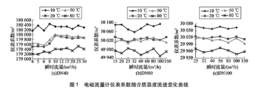 將實驗測得的管道污水處理進出水口流量計在不同溫度及流速下的儀表系數(shù)數(shù)據(jù)整理,特性曲線如圖1所示,3組曲線分別對應DN40, DN80, DN100的3塊管道污水處理進出水口流量計的儀表系數(shù)曲線。