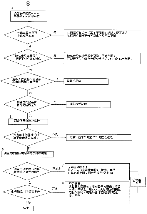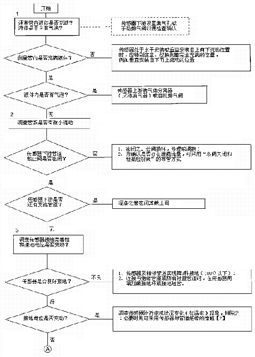 檢查流程圖*5項(xiàng)。信號回路絕緣下降會形成零點(diǎn)不穩(wěn)。信號回路絕緣下降的土要原因足,包極部位絕緣下降所引起的,但也不能排除信號電纜及其接線端子絕緣下降或破壞。因?yàn)橛袝r候現(xiàn)場環(huán)境十分嚴(yán)酷,稍一疏忽儀表蓋、導(dǎo)線連接處密封不慎,彌漫著潮氣酸霧或粉粒塵埃侵入儀表接線盒或電纜保護(hù)層,使絕緣卜降。信號回路絕緣電阻檢查分別按電纜側(cè)和流量傳感器側(cè)兩郵分進(jìn)行,用兆歐表測試。因信號電纜容易可先做。流量傳感器再分兩次進(jìn)行:充滿液體測黽電極表面接觸電阻和個管后測量,U極絕緣電阻。