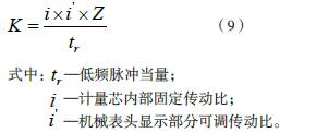 根據(jù)實(shí)際流量計的所測得儀表系數(shù)K 更換對應(yīng)齒輪傳動比,使機(jī)械表頭顯示部分和齒輪轉(zhuǎn)動發(fā)出低頻脈沖輸出均與高頻脈沖輸出匹配,實(shí)際三者關(guān)系如下: