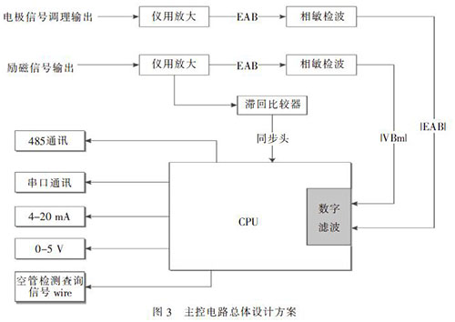 考慮到傳感器出來的微弱信號容易在傳輸線上損耗,故而電極信號調(diào)理板和空管檢測功能板就近放置于傳感器出線口,調(diào)理后經(jīng)屏蔽線傳輸至轉(zhuǎn)換器上的主控電路。
