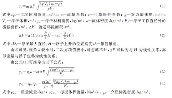 流量計垂直安裝在管道上,流體自下向上流經(jīng)錐管,浮子在P1、P2差壓作用下產(chǎn)生上升或下移,當(dāng)浮子此差壓(P2-P1)與浮子重力G、浮力F、粘滯力合力平衡時,處于平衡狀態(tài)。建立方程并推導(dǎo)(可參考相關(guān)專業(yè)資料,此處省略),忽略粘滯力影響,假設(shè)流量系數(shù)為常數(shù),可得出浮子位移與流量成線性對應(yīng)關(guān)系。浮子流量計的流量方程為: