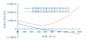 從以上數(shù)據(jù)表和曲線圖中可以看出:天燃?xì)饬髁坑?/strong>型號一定的情況下,用表體取壓孔取壓方式檢定流量計時流量計的線性度較好,用管道取壓孔取壓方式檢定流量計時流量計的線性度較差;流量測點相同的情況下,表體取壓孔取壓檢定方式的流量計誤差較小,管道取壓孔取壓檢定方式的流量計誤差較大;兩種取壓方式引起的誤差隨著流量的增大而逐漸增大,在流量為2?。梗埃埃恚常钑r兩者相差近6.2%,遠(yuǎn)遠(yuǎn)超出了流量計的準(zhǔn)確度等級。所以,在天燃?xì)饬髁坑?/strong>的檢定過程中,應(yīng)避免在流量計表體取壓孔以外的地方取壓進(jìn)行檢定。