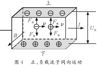 情形2:正、負(fù)載流子反向運(yùn)動(dòng)。如圖3所示,長(zhǎng)方體玻璃水槽中盛有NaCl的水溶液,水槽左、右側(cè)壁內(nèi)側(cè)各裝一導(dǎo)體片,在溶液中通入水平向右的電流,勻強(qiáng)磁場(chǎng)B垂直紙面向外。NaCl溶液中既有正離子,又有負(fù)離子,根據(jù)左手定則可判斷正離子受到向下的洛倫茲力,故向下運(yùn)動(dòng)并堆積。同理,負(fù)離子也受到指向下的洛倫茲力,也向下運(yùn)動(dòng)并堆積。由于正負(fù)離子均向下側(cè)面堆積,故上下兩側(cè)面的電勢(shì)均為零,但下側(cè)面處離子濃度大于上側(cè)面離子濃度。