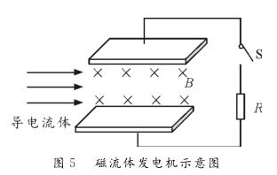 【例1】圖5為磁流體發(fā)電機(jī)示意圖。設(shè)兩金屬板間的距離為d,兩極板間勻強(qiáng)磁場(chǎng)的磁感應(yīng)強(qiáng)度為B。等離子體垂直進(jìn)入磁場(chǎng)的速度為v,單個(gè)離子所帶的電荷量為q。離子通道(即兩極板內(nèi)所圍成的空間)的等效電阻為r,負(fù)載電阻為R。則下列判斷正確的是( ?。?br /> A。該發(fā)電機(jī)的電動(dòng)勢(shì)E=Bdv