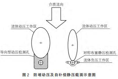 新智能分體式電磁流量計(jì)采用拋物面導(dǎo)向型結(jié)構(gòu)作為動(dòng)壓測(cè)點(diǎn),采用對(duì)稱自補(bǔ)償型式的靜壓測(cè)點(diǎn),可以有效地解決來(lái)流方向偏流時(shí)信號(hào)的穩(wěn)定采集,來(lái)流偏離管道軸線時(shí),可以維持輸出差壓基本不變,如圖2所示。