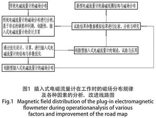電磁流量計因其特殊的結(jié)構(gòu)形式,致使其抗干擾能力較弱、準確度偏低以及瞬時流量波動過大等不良現(xiàn)象,但便于安裝、造價低廉、普遍應用于大管道等特點而存在。為了發(fā)揮其優(yōu)勢,消除其不利因素,對其內(nèi)部結(jié)構(gòu)及其相關(guān)技術(shù)參數(shù)進行優(yōu)化設計,從而使其準確度能夠達到 ±1% FS,使抗干擾能力得到極大地增強。本文主要通過優(yōu)化設計、選擇材料和試驗,使電磁流量計的穩(wěn)定性和準確度大幅度提高,并提出解決措施,對實際應用具有參考價值。分析與研究程序圖如圖 1 所示。