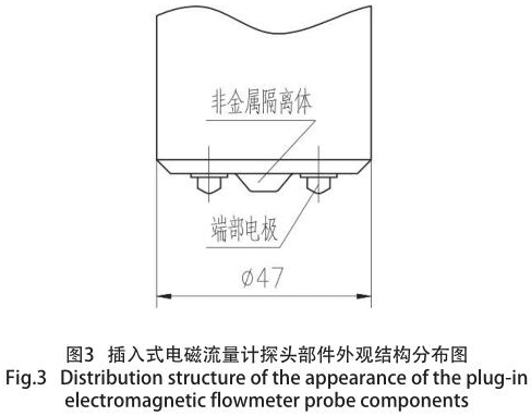 通過大量的試驗,對探頭端部外型結(jié)構(gòu)亦采用特殊設計,從而消除兩個電極之間的擾流現(xiàn)象,同時亦消除因通電產(chǎn)生磁場,導致兩個電極吸附介質(zhì)中的鐵屑而影響測量精度和死區(qū)效應,增強了輸出信號的穩(wěn)定性,從而提高傳感器準確度和抗干擾性。通過結(jié)構(gòu)的優(yōu)化設計,使用壽命更長,電磁流量計探頭局部,如圖 3 所示。
