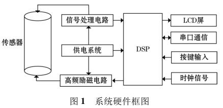 高頻勵磁煤焦油流量計由傳感器、高頻勵磁電路、信號處理電路等組成,其中高頻勵磁電路決定著傳感器磁場的強弱,勵磁電路的穩(wěn)定性以及精確性決定著系統(tǒng)檢測的準確性以及穩(wěn)定性。DSP 系統(tǒng)控制勵磁電路激勵傳感器線圈,當(dāng)線圈中有導(dǎo)電液體流過時,其切割磁感線并在傳感器兩端的線圈上產(chǎn)生感應(yīng)電動勢,利用信號檢測電路監(jiān)測感應(yīng)電動勢的大小,*后根據(jù)相應(yīng)關(guān)系計算出液體的流量,系統(tǒng)硬件框圖如圖 1 所示。