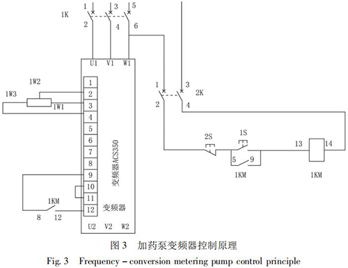 STD - Ⅲ型浮選工藝參數(shù)自動測控系統(tǒng)通過雙膜盒差壓計測量原礦漿濃度; 采用地下水污水流量計測量原礦漿流量,由 PLC 計算出入浮干煤泥量和藥劑的瞬時添加量,用變頻式計量泵完成浮選藥劑的添加。通過上位機(jī)還可以打印小時、班、天及月的運行數(shù)據(jù),更加有利于生產(chǎn)管理及技術(shù)分析,藥劑自動原理如圖 2 所示,k1、k2、k3 是計算修正參數(shù)。以 PID 算法為核心,通過優(yōu)化控制程序計算出藥劑給定量,在捕收劑和起泡劑管道上分別安裝藥劑測量裝置,用于檢測藥劑的添加量。當(dāng)藥劑測量值小于藥劑給定量時,PID 輸出增大,反之則減小。加藥泵變頻器控制原理如圖 3 所示。