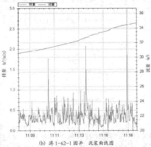 在固井全程的曲線中,也可以發(fā)現(xiàn)開(kāi)始固井的時(shí)候.泥漿排量雜波較小,究其原因是剛開(kāi)始固并時(shí),泥漿管線剛泄壓,管線中還是充滿(mǎn)了液體,雖然振動(dòng)強(qiáng)度雷同.但是葉片有阻尼,振幅較小.對(duì)其影響也較小。例如曲線圖的11;03: 00-11: 03: 53之間的泥漿排量沒(méi)有雜波。在港1-62-1固井過(guò)程中,水泥漿打了413澎,結(jié)果本應(yīng)該是0的泥漿,卻走數(shù)了23.0 m',其影響可謂巨大.并非通過(guò)普通的濾波或切除所能排除,必須執(zhí)行一個(gè)特殊算法。