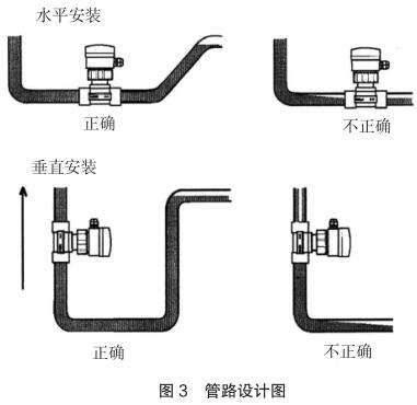 現(xiàn)場安裝時應注意遠離可能對其產生干擾的大型設備,防止長期的熱輻射和其他如磁場直射等環(huán)境影響。為確保高測量精度和較好的零點穩(wěn)定性,進行校正前,智能型電磁流量計應裝入工藝介質中至少 24 小時電極鈍化。安裝的管路設計應確保管道始終充滿流體,防止測量誤差,管路設計圖見圖 3。
