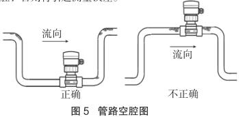 測量流向取決于智能型電磁流量計的安裝方位,將智能型電磁流量計在接頭上旋轉 180 度即可反向。正流向時,智能型電磁流量計的突耳應在上游方向。流量顯示總是正的,而累加器可以根據(jù)流向增加或者減少。安裝中確認管路設計不允許在介質中產生氣泡或空腔,否則將引起測量誤差(見圖 5)。