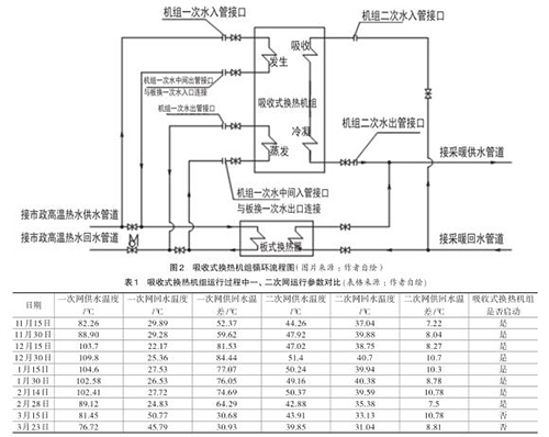 此熱力站高溫渦街流量計(jì)的一次網(wǎng)設(shè)計(jì)供回水設(shè)計(jì)溫度為 :120℃ /36℃,二次網(wǎng)設(shè)計(jì)供回水溫度為 :80℃ /60℃。在高溫渦街流量計(jì)工作流程中(見(jiàn)圖2),高溫?zé)嵩矗匆淮尉W(wǎng)供水)先進(jìn)入高溫渦街流量計(jì),發(fā)生器作為驅(qū)動(dòng)熱源,換熱后進(jìn)入板式換熱器,經(jīng)板式換熱器換熱后的低溫水再次回到高溫渦街流量計(jì)的蒸發(fā)器,放熱至36℃后返回電廠。熱用戶(hù)的二次網(wǎng)回水并聯(lián)后分別進(jìn)入高溫渦街流量計(jì)吸收器和板式換熱器,在吸收器和冷凝器及板式換熱器中分別進(jìn)行熱交換,然后一起供給熱用戶(hù)。上述過(guò)程就是在高溫渦街流量計(jì)啟動(dòng)時(shí),熱力站內(nèi)的實(shí)際供熱流程,在供暖季的初期和末期,可以關(guān)閉高溫渦街流量計(jì),仍然利用板式換熱器單好換熱。