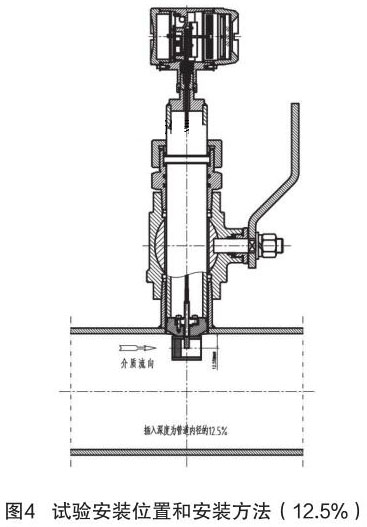 根據(jù)中華人民共和國機械行業(yè)標準:JB/T9249-2015《流量計》進行煙氣流量計的研制與設計。在試驗過程中,因為理論研究不充分,再加上經(jīng)驗不足,采用插入深度是按照以往其它產(chǎn)品(插入式電磁流量計)的經(jīng)驗,以插入深度為現(xiàn)場管道內(nèi)徑的 12.5% 進行試驗,其對介質流量的檢測值與同種規(guī)格管道法蘭式結構的流量計進行比較,偏差值較大、儀表準確度無法滿足設計要求。試驗安裝位置和安裝方法如圖 4 所示。