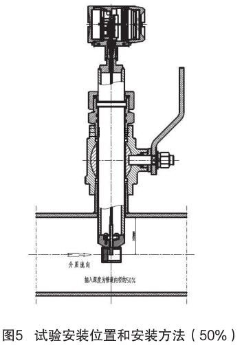 對插入式渦街流量計和插入式電磁流量計的結構原理進行分析,插入式電磁流量計的信號采集點在標校管道內(nèi)12.5% 為宜,因它屬電磁類流量計,而流量計是根據(jù)“卡門渦街”原理進行測量管道內(nèi)流量,根據(jù)標校管道內(nèi)層流和湍流的分析,以及流量計獨特的探頭結構形式,確定煙氣流量計的插入深度為標校管道內(nèi) 50%,試驗安裝位置和安裝方法如圖 5 所示。