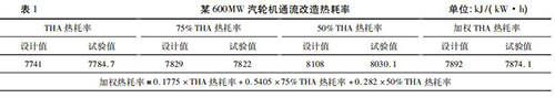 隨著火電機組利用小時數(shù)降低,發(fā)電企業(yè)一般都會根據(jù)不同負荷工況下的實際運行小時數(shù),確定機組熱耗率考核權重,形成*終的加權熱耗率考核值??己思訖酂岷穆蕦υO備廠家末級葉片選型、高壓調(diào)門與高壓缸匹配性提出了更高的要求,在當前負荷率偏低的情況下增強了發(fā)電企業(yè)的競爭力。然而,僅僅對加權熱耗率進行考核是不夠的,設備廠家為了增強自身的競爭力,往往會把全部重點放在如何降低占比大的低負荷熱耗率上而犧牲高負荷的熱耗率,這無疑削弱了發(fā)電企業(yè)的適應性。某廠一臺 600MW 汽輪機通流改造時僅對加權熱耗率進行考核,THA 熱耗率要高出設計值43. 7 kJ/( kW·h) ,詳見表 1。通流改造時既要對加權熱耗率進行考核,也要對 THA工況時熱耗率進行考核。
