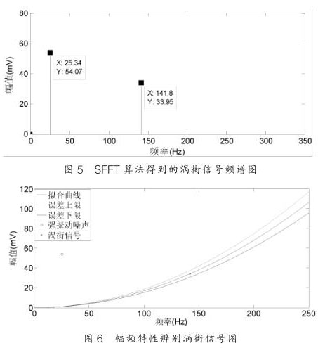 從圖 5 可以看出 SFT 算法能夠很好恢復,對渦街信號的頻率恢復沒有誤差,而幅值的誤差不超過 1% ,這對含有強振動噪聲的渦街信號精確測量至關重要;圖 6 是經(jīng) SFT 頻譜分析所得到的數(shù)據(jù)通過幅頻特性曲線來辨別是噪聲信號還是渦街信號。通過幅頻關系的信號處理方法可以從含有振動的混合信號中識別渦街信號,從而達到提高液化氣流量計抗振動性能的目的。