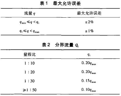 在GB21391--2008《用氣體渦輪流量計(jì)測量天然氣流量》對分界流量q,有明確的定義,即低于該流量要采用擴(kuò)展誤差限的流量值。標(biāo)準(zhǔn)*5.2條從*大允許誤差和量程比兩方面對分界流量做出了規(guī)定,且明確了量程比是在*大允許誤差范圍內(nèi)流量計(jì)的*小流量和*大流量之比。該標(biāo)準(zhǔn)中對渦輪流量計(jì)要求的*大允許誤差如表1所示,量程比與分界流量q,的關(guān)系如表2所示。
