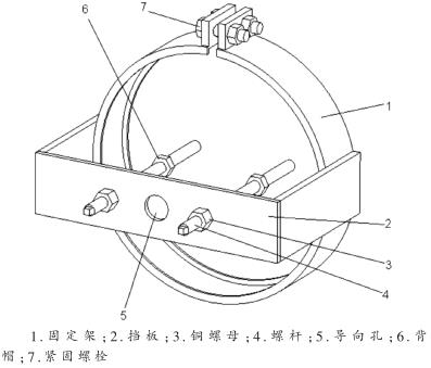 固定架是以金屬板料為主體加工而成的半開(kāi)環(huán),環(huán)開(kāi)口處設(shè)置緊固螺栓,環(huán)內(nèi)外均設(shè)置卡環(huán)。擋板是由一定厚度的金屬板加工而成的U形構(gòu)件,焊接于固定環(huán)兩側(cè),擋板中間設(shè)置了一個(gè)導(dǎo)向孔,導(dǎo)向孔兩側(cè)各有一個(gè)安裝銅螺母的通孔。螺桿由較高強(qiáng)度的金屬棒料加工而成,其一端螺紋與閥蓋螺孔的螺紋一致,用于連接閥蓋上的螺孔,并設(shè)有背帽防止螺桿脫離閥蓋;中段及另一端的螺紋均為梯形螺紋,與銅螺母的螺紋一致。