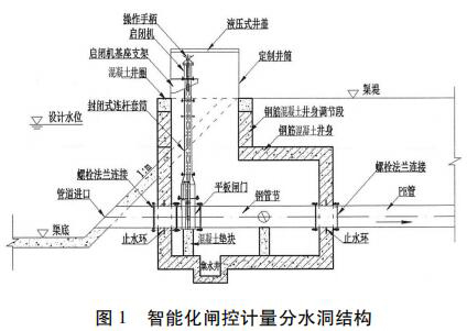 分水洞采用了一種封閉式啟閉閘集成閘井預制件,包括頂節(jié)、標準節(jié)和底座。與傳統(tǒng)現(xiàn)場澆筑的方式相比,集成閘井采用防水設(shè)計,并且安裝更加方便快捷,很大程度上提高了安裝效率,節(jié)約成本。采用事先預制好的啟閉閘支座、啟閉機機座,保證了設(shè)備的安裝精度,提高了設(shè)備運行的穩(wěn)定性,減少了設(shè)備的后期維護。分水洞結(jié)構(gòu)除了預制混凝土外,還可考慮采用玻璃鋼或工程塑料整體制作,用標準節(jié)調(diào)節(jié)高度。分水洞結(jié)構(gòu)設(shè)計見圖 1。