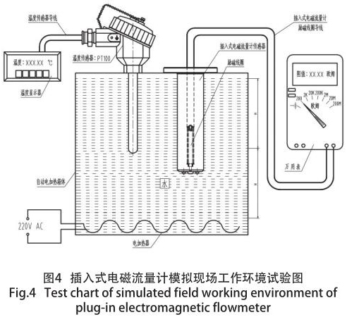 其原因是:勵磁線圈的阻值及匝數(shù)是按照常溫狀態(tài)下進(jìn)行設(shè)計的,而含有勵磁線圈的測水流量計經(jīng)常是高于常溫狀態(tài)下進(jìn)行安裝、使用(如:高爐回水、供熱管道等),勵磁線圈的阻值隨使用環(huán)境溫度的變化而變化,致使測水流量計測量時的準(zhǔn)確度大為降低,性能的不確定性大為增加,為了保證儀表的高準(zhǔn)確度和穩(wěn)定性,在不同的季節(jié)(主要是環(huán)境溫度和介質(zhì)溫度),經(jīng)過大量模擬現(xiàn)場實際情況的試驗,并結(jié)合轉(zhuǎn)換器的技術(shù)參數(shù)要求,得出一個完善的勵磁線圈各種技術(shù)參數(shù)。模擬現(xiàn)場試驗裝置如圖 4 所示。