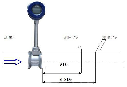 測壓孔和測溫孔的安裝設(shè)計。被測管道需要安裝溫度和壓力變送器時,測壓孔應設(shè)置在下游3-5D處,測溫孔應設(shè)置在下游6-8D處,見圖(七)。D為儀表公稱口徑,單位:mm