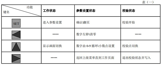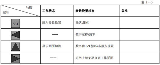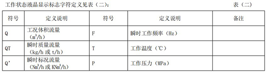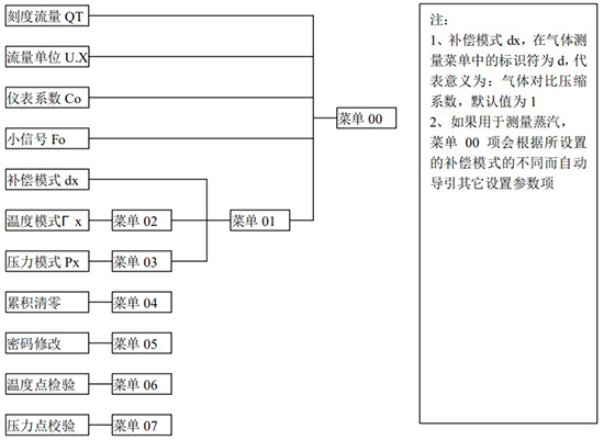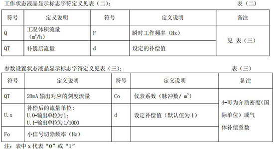 (3)標(biāo)況流量計算公式(若補償后單位為 U.0):(4)標(biāo)況流量計算公式(若補償后單位為 U.1):注:標(biāo)況指 20℃,1 標(biāo)準(zhǔn)大氣壓三、一體化液晶顯示表頭參數(shù)設(shè)置操作說明(V03Z)1、鍵盤按鍵說明2、 顯示窗字符說明注:表中 x 代表“0”或“1”;Zn:標(biāo)準(zhǔn)狀態(tài)下(20℃,1 標(biāo)準(zhǔn)大氣壓),被測氣體的壓縮系數(shù),Z:工作狀態(tài)下被測氣體的壓縮系數(shù)3、 操作說明3.1、本儀表表頭采用自導(dǎo)引式和菜單式相結(jié)合的參數(shù)設(shè)置方式,所謂自導(dǎo)引式參數(shù)設(shè)置方式就是用戶在進(jìn)入菜單 00 項后,表頭中的微電腦會自動導(dǎo)引用戶去設(shè)置需要設(shè)置的參數(shù)。另外,用戶也可以通過菜單模式分別對各組參數(shù)進(jìn)行設(shè)置。蒸汽測量菜單框圖如下:3.2、參數(shù)設(shè)置約定:在設(shè)置各項參數(shù)時,提示符閃動代表該項參數(shù)沒有設(shè)置完或者尚未確認(rèn),可以通過按SET 鍵來確認(rèn)或者按→鍵退出;提示符不閃動代表該項參數(shù)已設(shè)置完并確認(rèn),此時可以通過按 SET 鍵翻頁或者按→鍵退出。進(jìn)入?yún)?shù)設(shè)置時,需要輸入密碼(6 位)并確認(rèn)進(jìn)入,為了防止誤進(jìn)入?yún)?shù)設(shè)置菜單,保證儀表正常工作,在設(shè)置密碼時,使用↑鍵調(diào)數(shù)時不能循環(huán)調(diào)數(shù),只能單次調(diào)數(shù),只有密碼輸入正確進(jìn)入各項參數(shù)設(shè)置菜單后才可以對各位循環(huán)連續(xù)調(diào)整數(shù)據(jù)。3.3、儀表參數(shù)設(shè)置舉例:儀表出廠前各項參數(shù)已設(shè)置好,用戶無需設(shè)置。如果用戶需要設(shè)置某項參數(shù),請參照以下步驟,例如修改刻度流量值 QT:在工作狀態(tài)下,按 SET 鍵,顯示屏顯示 P,數(shù)字位為全零,8 秒鐘若無操作,自動返回工作狀態(tài)。輸入密碼 :按數(shù)字↑鍵和左移←鍵,輸入密碼數(shù) xxxxx(出廠時默認(rèn)密碼為 000123),↑鍵調(diào)各位數(shù)字 0-9,每按 ←鍵一次數(shù)字向右循環(huán)一位,可通過多次按←鍵對整段數(shù)字清零,按→鍵可以返回工作狀態(tài)。菜單選擇項:按 SET 鍵確認(rèn),顯示屏顯示如右圖所示,末行“00”閃動調(diào)整該項值選擇不同參數(shù)設(shè)置菜單。該例直接按 SET 鍵進(jìn)入菜單 00 項設(shè)置刻度流量:QT 閃動,*一步:*先進(jìn)行小數(shù)點調(diào)整,可以通過←鍵對參數(shù)快速清零或者通過↑鍵進(jìn)行小數(shù)點調(diào)整,調(diào)整完畢,按 SET 鍵確認(rèn)(QT 仍閃動);*二步:數(shù)值調(diào)整,可以通過↑鍵對每位數(shù)字進(jìn)行調(diào)整,按 ←鍵一次數(shù)字向右移動一位,調(diào)整完畢,按 SET 鍵確認(rèn),QT 停止閃動,該項參數(shù)設(shè)置完畢,可進(jìn)行下一項參數(shù)設(shè)置或者退出另外,單位設(shè)置 U.X 和補償方式設(shè)置 dX 通過↑鍵調(diào)整修改。3.4、校驗項說明: 儀表出廠前,溫度和壓力通道已校驗設(shè)置好,無需用戶重新校驗。校驗通道有密碼保護(hù),廠家不對外開放,如果需要重新校驗溫度或者壓力通道,請專業(yè)人員與廠家技術(shù)人員聯(lián)系。4、計算公式說明4.1、蒸汽測量計算公式(1)渦街流量儀表工況體積流量計算公式:(2)密度 d,單位 Kg/m3(3)質(zhì)量流量計算公式,單位 Kg/h:(4)質(zhì)量流量計算公式,單位 t/h:4.2、氣體測量計算公式----標(biāo)況指 20℃,1 標(biāo)準(zhǔn)大氣壓(1)渦街流量儀表工況體積流量計算公式:(2)對比壓縮系數(shù) d(Zn/Z),單位 1(3)標(biāo)況流量計算公式,單位 Nm3/h:P1—工況絕壓,PN—標(biāo)況絕壓(Mpa),T1—工況熱力學(xué)溫度,TN—標(biāo)況熱力學(xué)溫度(K)