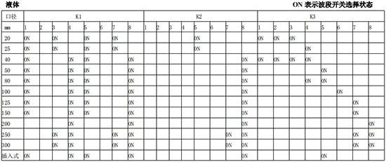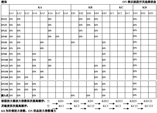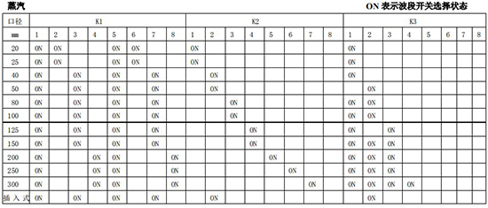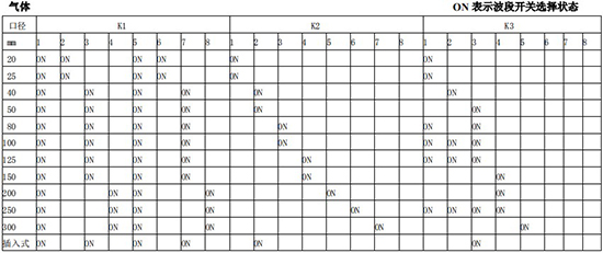 (4)標(biāo)況流量計算公式,單位 t/h:四、AMPKP09A01 放大板波段開關(guān)調(diào)整參照表五、AMPSW10A01 放大板波段開關(guān)調(diào)整參照表RG=1-F 調(diào)放大器增益,由 1 至 F 依次增大(常用 4-8);RS=1-F 調(diào)觸發(fā)靈敏度,由 1 至 F 依次提高(常用 4-8)不同口徑和介質(zhì)開關(guān)選擇參見附表。并根據(jù)實際信號先調(diào)整 K2 和 K3 擴展頻帶,必要時調(diào)整 K1 電荷放大器增益以上表值僅供參考,實際使用中因液體粘度和氣體密度不同應(yīng)在此值附近調(diào)整,頻率低時可將 K3 向大口徑方向調(diào)一至三檔。頻率高時可將 K2 向小口徑方向調(diào)一至三檔。訂貨須知及選型樣譜一.尊敬的用戶,當(dāng)您要選用本公司產(chǎn)品時,請仔細(xì)閱讀選型樣本,并做好以下工作:1.認(rèn)真核對被測介質(zhì)的工況條件:溫度、壓力、管徑等工藝參數(shù)。2.認(rèn)真核對被測介質(zhì)的使用流量范圍,特別是*小流量值以*終確定使用儀表的口徑及配管參數(shù)。3.確定儀表的安裝地點,保證直管段,并為儀表的安裝維護(hù)創(chuàng)造好的環(huán)境條件。4.填好訂貨咨詢單,見附表三二.渦街流量儀表選型表(符合 JB/T9294-1999 標(biāo)準(zhǔn))1.傳感器選型表上一篇:污水流量計的種類