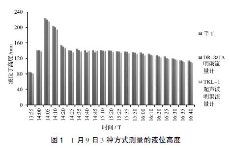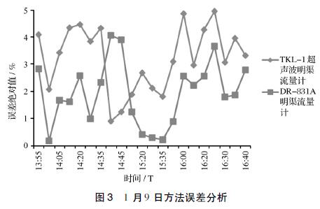 見圖3,以手工實(shí)測液位高度為基準(zhǔn),2種流量計(jì)的誤差均在±5%的范圍內(nèi)。除在1月9日14:40和14:45兩個(gè)時(shí)間點(diǎn)測量值表現(xiàn)出DR-831A測量誤差高于TKL-Ⅰ外,其他時(shí)段都明顯表現(xiàn)出DR-831A測量誤差小于TKL-Ⅰ。
