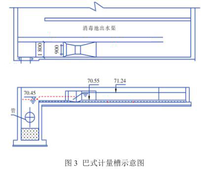 該廠改造后出水經(jīng)二氧化氯消毒后直接排放,為節(jié)省占地,出水明渠與接觸消毒池合建,位于接觸池末端。消毒池出水經(jīng)堰板跌水后通過2.3米的孔洞180°轉(zhuǎn)彎流入出水計(jì)量明渠。如圖3所示。采用巴式計(jì)量槽+超聲波液位計(jì)測定流量。