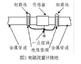 由于一體式污水流量計(jì)價(jià)格的測量感應(yīng)電壓很小,電壓較低,易受外界電磁噪聲的影響,故在安裝時(shí)應(yīng)進(jìn)行可靠的接地連(跨)接。金屬管道一體式污水流量計(jì)價(jià)格接地連(跨)接方法如圖3所示。