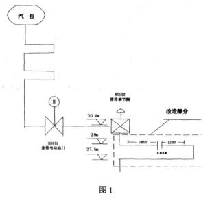 異形孔板安裝在鍋爐30米處連排管段,截去一段加裝U形管段的來流直管段上,根據(jù)安裝要求,測點(diǎn)位置選在距離上游直管段1810mm,距離下游直管段1085mm處。符合“距離上游直管段>10D(D=56mm,管道內(nèi)徑),距離下游直管段>5D”的要求。孔板的取壓管為垂直向下,圓缺孔板的弦與管道橫截面水平中心線平行安裝。其改造安裝圖如圖1所示。