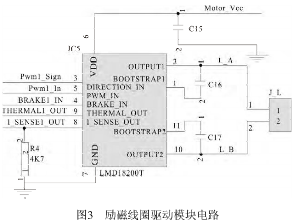 由于探頭尺寸較小,所產(chǎn)生的勵磁電流很弱,由于探頭尺寸較小,所產(chǎn)生的勵磁電流很弱,要處理這樣的信號,則后續(xù)的放大電路要有足夠高要處理這樣的信號,則后續(xù)的放大電路要有足夠高的輸入阻抗和較大的增益,來保證傳感器的靈敏度的輸入阻抗和較大的增益,來保證傳感器的靈敏度及抗干擾性;為了防止交流及抗干擾性;為了防止交流50Hz的工頻干擾,選的工頻干擾,選用方波電流作為勵磁電流,其頻率選用用方波電流作為勵磁電流,其頻率選用12.5Hz,它是1/4的工頻頻率,這樣可有效地抑制工頻干擾。勵磁信號在單片機(jī)內(nèi)部生成,從*勵磁信號在單片機(jī)內(nèi)部生成,從*26腳輸出12.5Hz方波信號,接到勵磁線圈的驅(qū)動模塊電路方波信號,接到勵磁線圈的驅(qū)動模塊電路IC5(LMD18200T LMD18200T)的3腳信號,它的內(nèi)部采用腳信號,它的內(nèi)部采用H橋式驅(qū)動,送出勵磁電流加到其橋式驅(qū)動,送出勵磁電流加到其2腳和10腳之間的勵磁線圈上。在勵磁線圈L上形成20~30mA方波電流,它與控制方波電壓同步。使流體運(yùn)動切割波電流,它與控制方波電壓同步。使流體運(yùn)動切割磁力線產(chǎn)生的方波電壓與勵磁電流完全保持同步, 磁力線產(chǎn)生的方波電壓與勵磁電流完全保持同步,這樣也便于在接收放大電路中信號的同步解調(diào)。電路如圖3所示。
