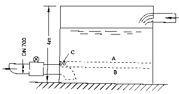 案例4 廣西某水廠在郊區(qū)山頭設(shè)置清水池,利用水池高度勢能發(fā)送成品水。運(yùn)行人員反映計(jì)量出水量的DN700mm酸堿污水流量計(jì)有時(shí)候流量顯示不穩(wěn)?;蝿?dòng)達(dá)百分之十幾到百分之二十,誤差也大,估計(jì)相差約20%?,F(xiàn)場考查發(fā)現(xiàn)水池如圖7-9所示安裝流量傳感器,水位高度不足就會(huì)卷入氣泡,甚至流量傳感器測量管內(nèi)不能充滿。如水位降至A線時(shí),雖高出吸入口頂端,但高出不多,還會(huì)在C處產(chǎn)生旋渦,將水位表面空氣卷入形成氣泡,使顯示晃動(dòng);若水位降到B,測量管將不滿管。我們建議如圖虛線所示裝一彎頭,擴(kuò)大水池有效容量,減少吸入氣泡的機(jī)會(huì),彌補(bǔ)原設(shè)計(jì)的不足。這類實(shí)例是經(jīng)常遇到的。